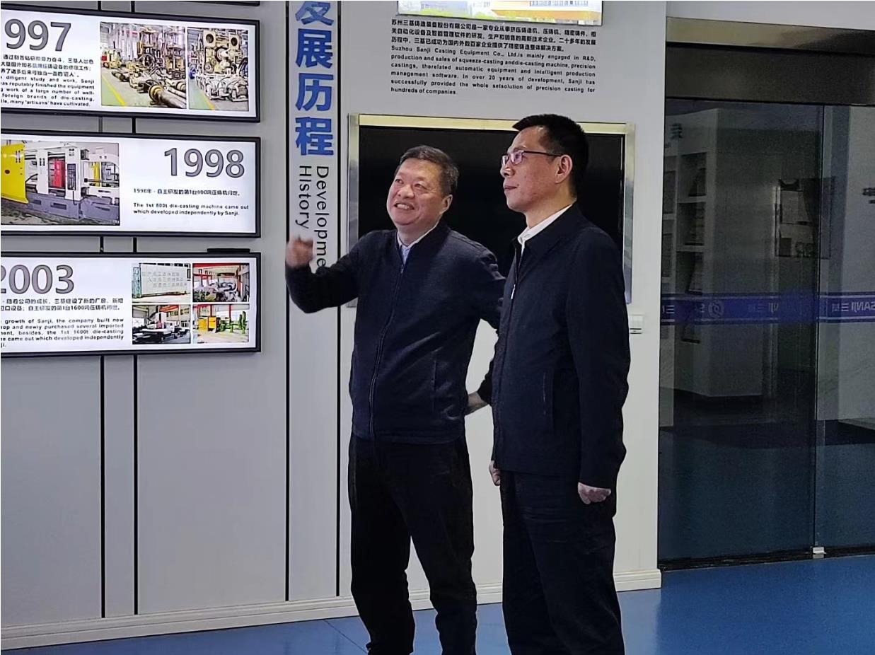 11月17日上午,中國(guó)鑄造協(xié)會(huì)張志勇常務(wù)副會(huì)長(zhǎng)、上海辦事處楊楊主任一行蒞臨蘇州三基鑄造裝備股份有限公司考察指導(dǎo)。公司許善新董事長(zhǎng)接待并詳細(xì)介紹了蘇州三基的發(fā)展歷程、技術(shù)發(fā)展現(xiàn)狀以及馬鞍山三基項(xiàng)目投產(chǎn)進(jìn)展情況。張會(huì)長(zhǎng)還特別了解了三基擠壓鑄造(液態(tài)模鍛)技術(shù)和裝備相關(guān)情況。